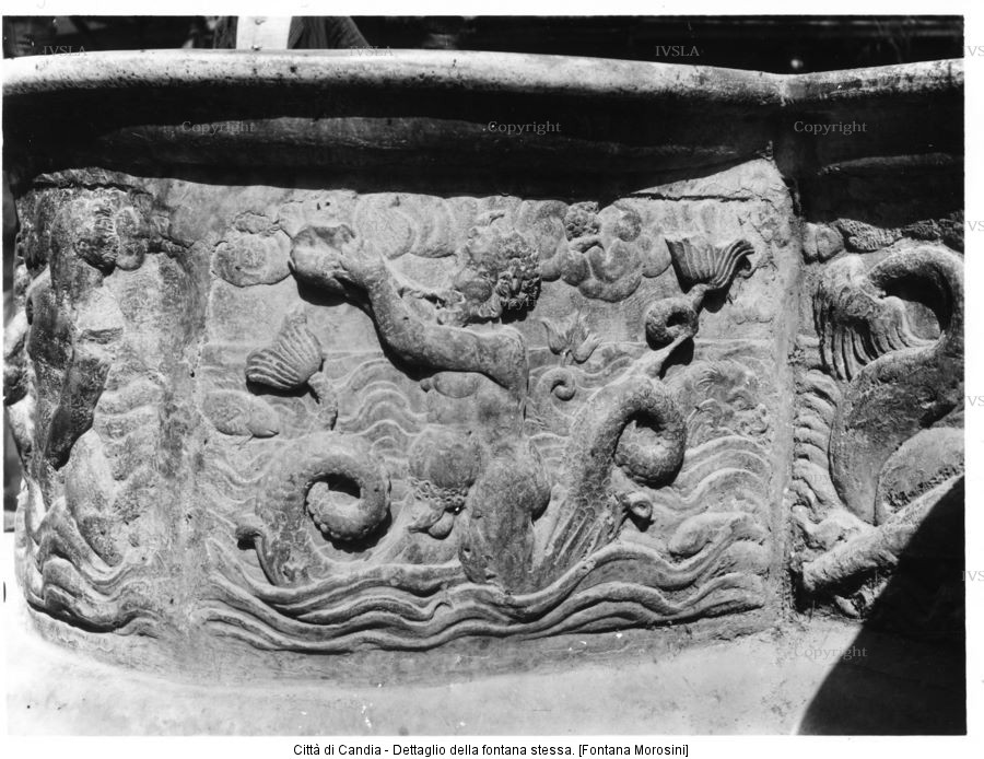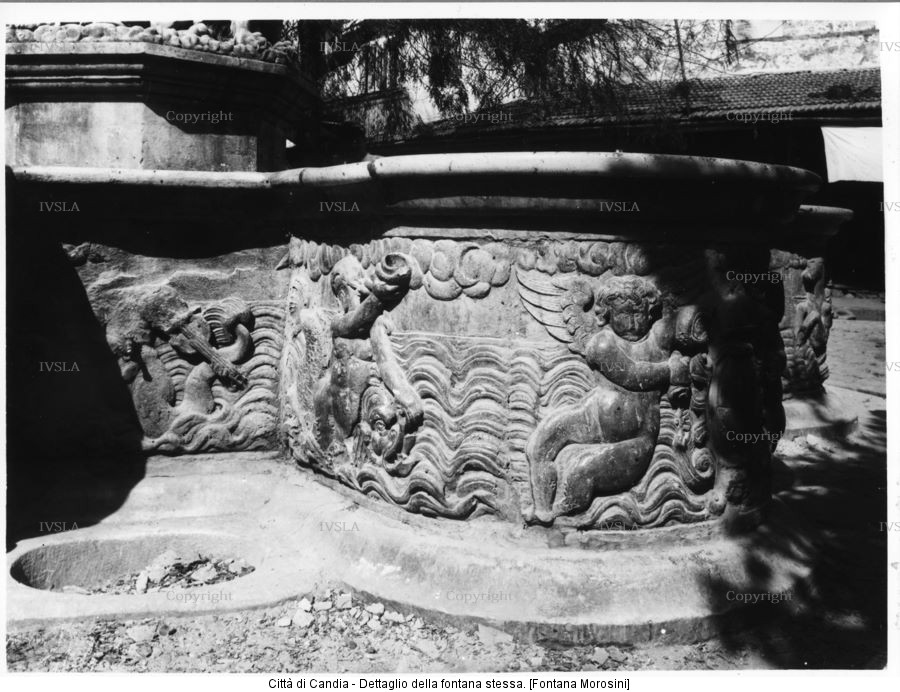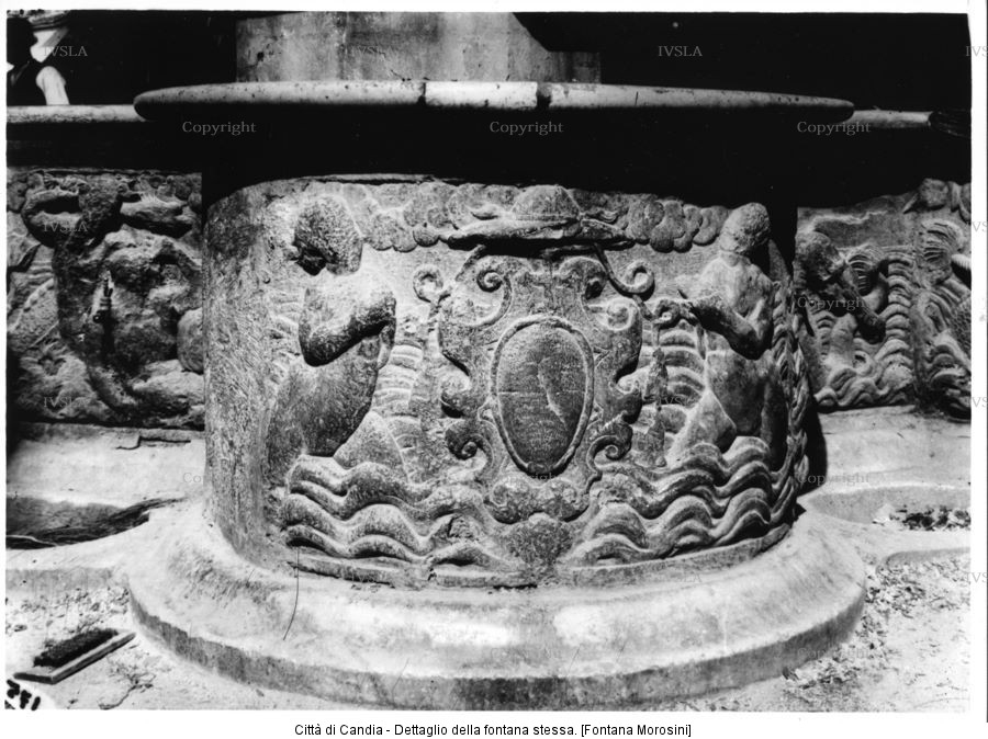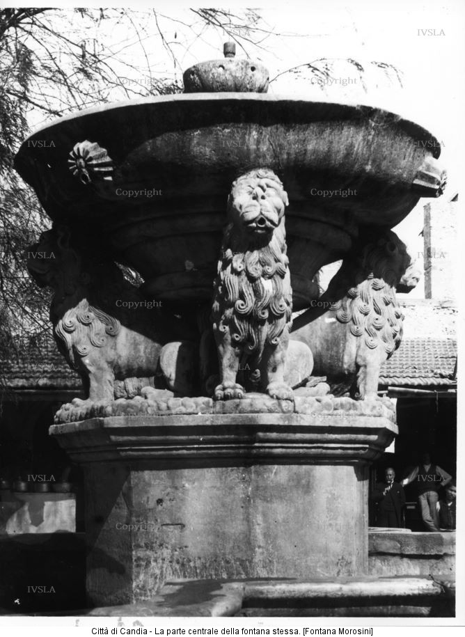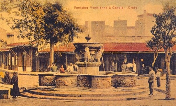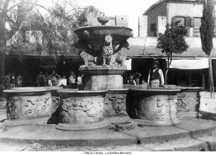 The fountain which the Governor Fr. Morosini constructed in 1628 was the final act of his huge project to deal once and for all with the lack of fresh water in the city through the construction of an aqueduct, which could transport the water from the springs of the Mount Giouchtas. The eight lobes of the fountain’s tank bear sculpted decoration from the maritime life (nymphs, tritons, dolphins, hippocampi and sea-demons). Over the water basin, which was supported by four lions, stood the oversize statue of Poseidon, the notorious Gigante, stepping on a dolphin. The decoration was executed by the sculptor Thomas Benetos or Frabenetos of Rethymnon and his brothers. In 1847 the Ottomans covered the fountain with a marble superstructure, bearing the inscription “Fountain of Abdülmecit” in order to transform it into a kiosk of public benefit (sebil). After the liberation of Crete in 1900 the superstructure was demolished and the fountain was restored, but the statue of Poseidon on the dolphin had already disappeared.