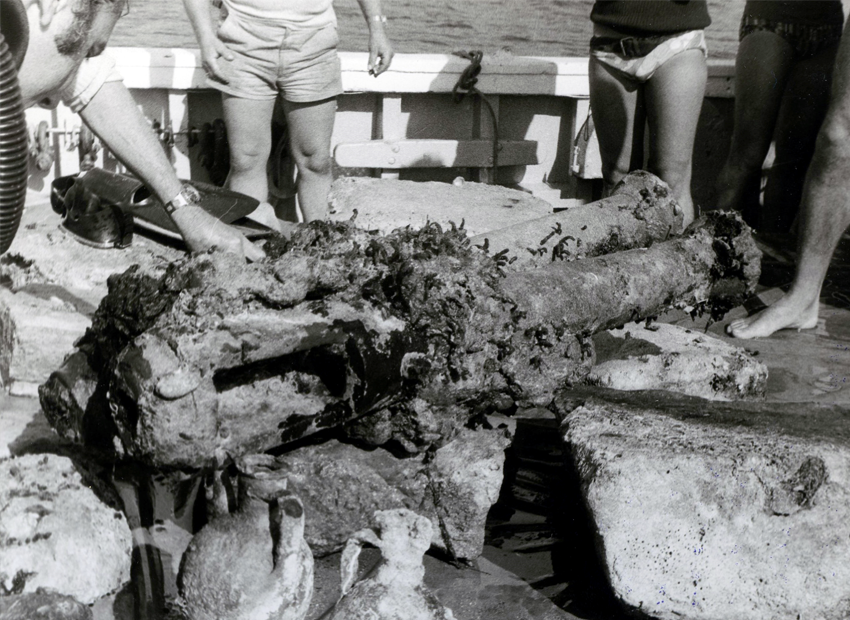 Στην επιφάνεια του βυθού ήταν ορατά ξύλα από το σκαρί του πλοίου, δύο μπρούτζινα κανόνια, πήλινα και χάλκινα σκεύη. Στην διάρκεια του καθαρισμού για την απελευθέρωση και ανέλκυση των κανονιών εντοπίστηκαν από κάτω αρχιτεκτονικά μέλη, τα οποία λειτουργούσαν προφανώς ως έρμα για την σταθεροποίηση του πλοίου. Κάποια από αυτά ανήκουν σε αρχαία κτίρια.