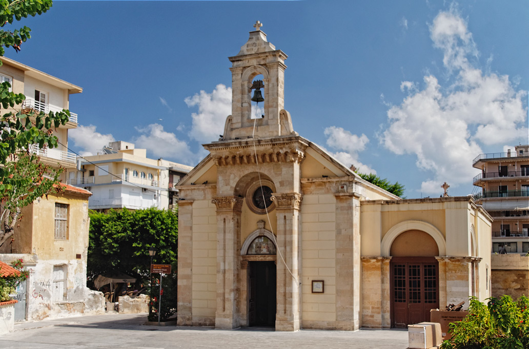 Ο μικρός ναός του Αγίου Μηνά βρίσκεται στο δυτικό άκρο της πλατείας της Αγίας Αικατερίνης και ΒΔ του ομώνυμου μητροπολιτικού ναού. Στη σημερινή του μορφή είναι δίκλιτος, με το νότιο κλίτος αφιερωμένο στην Υπαπαντή και το βόρειο στον Άγιο Μηνά. Στο σχέδιο του Μανέα Κλόντζα (1628-1645) και το χάρτη του R. Werdműller (1668) στη θέση αυτή σημειώνεται μονόχωρος ναός αφιερωμένος στην Παναγία Παντάνασσα, που αναφέρεται για πρώτη φορά το 1548. Στον κατάλογο των τελευταίων χρόνων της Βενετοκρατίας που διέσωσε ο F. Cornelius η εκκλησία αναφέρεται για πρώτη φορά ως Παναγία Παντάνασσα και Άγιος Μηνάς. Με τη βενετσιάνικη εκκλησία ταυτίζεται το βόρειο κλίτος, όπως δείχνουν η οξυκόρυφη καμάρα με ενισχυτικά σφενδόνια, το γοτθικού τύπου παράθυρο στο βόρειο τοίχο και η βάση του αρχικού κωδωνοστασίου στο δυτικό άκρο του βόρειου τοίχου. Το νότιο κλίτος προστέθηκε πιθανότατα κατά την ανακαίνιση του 1735, προκειμένου ο ναός να λειτουργήσει ως επισκοπική έδρα. Την εποχή αυτή πρέπει να μεταφέρθηκε στο νότιο τοίχο του νεότερου κλίτους το ανώφλιο παραθύρου με ελισσόμενο βλαστό και οικόσημο με λέοντα, που πιθανότατα βρισκόταν στο νότιο τοίχο του αρχικού ναού.